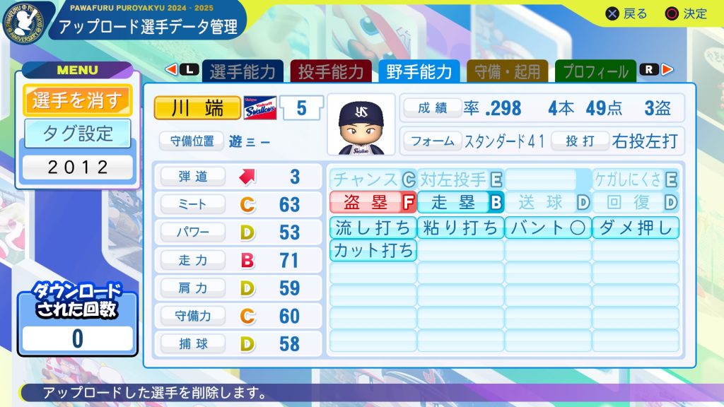 バント◯:13犠打、成功率.867(15-13)。デフォにもあり。